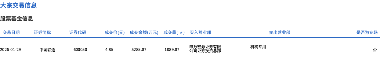 1月29日,中国联通大宗交易成交1089.87万股,成交额5285.87万元,占当日总成交额的2.77%,成交价4.85元,较市场收盘价5.15元折价5.83%。 | 交易日期 | 证券简称 | 证券代码 | 成交价(元) 成交金额(万元) 成交量( * ) 买入营业部 | | 卖出营业部 | | --- | --- | --- | --- | --- | --- | | 2026-01-29 | 中国联通 | 600050 | 1089.87 4.85 5285.87 | 机构专用 | | ...