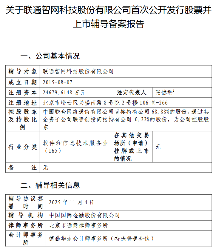 | 辅导协议签 | | 2025年11月4日 | | --- | --- | --- | | 署 时 | 间 | | | 舞 导 机 构 | | 中国国际金融股份有限公司 | | 律师事务所 | | 北京市通商律师事务所 | | 会计师事务 | | 德勤华永会计师事务所(特殊普通合伙) | | 所 | | | 智网科技成立于2015年,是中国联通旗下专业从事车联网业务的控股子公司。中国联通直接持有智网科 技68.88%的股份,通过其全资子公司联通创投间接持有智网科技0.33%的股份,为公司控股股东。 【大河财立方消息】11月10日,证监会网站显示,联通智网科技股份有限公司(简称智网科技)已启动 上市辅导。11月4日,智网科技与中金公司签署了辅导协议。 | 辅导对象 | 联通智网科技股份有限公司 | | | --- | --- | --- | | 成立日期 | 2015-08-07 | | | 注册资本 | 24679.6148 万元 法定代表人 | 张然懋1 | | 注册地址 | 北京市密云区兴盛南路 8号院 2 号楼 106 室-266 | | | 控股股东 | 中国联合网络通信有限公司直接持有公司 68. ...