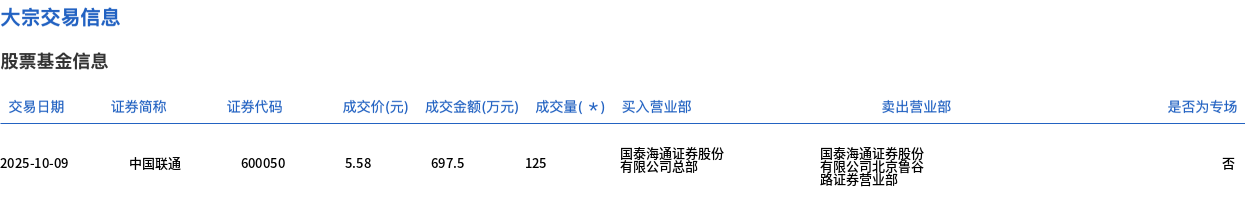 10月9日,中国联通大宗交易成交125万股,成交额697.5万元,占当日总成交额的0.3%,成交价5.58元,较市场收盘价5.58元持平。 | | | ...