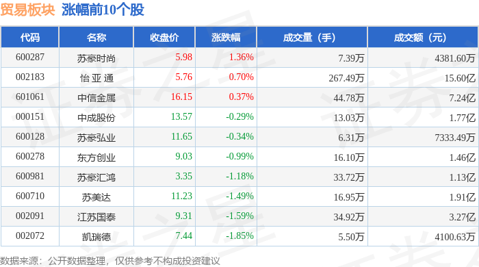 证券之星消息,1月28日贸易板块较上一交易日上涨2.4%,中信金属领涨。当日上证指数报收于 4151.24,上涨0.27%。深证成指报收于14342.9,上涨0.09%。贸易板块个股涨跌见下表: | 代码 | 名称 | 收盘价 | 涨跌幅 | 成交量(手) | 成交额(元) | | | --- | --- | --- | --- | --- | --- | --- | | 601061 | 中信金属 | 17.05 | 7.57% | 58.18万 | | 9.66亿 | | 600058 | 五矿发展 | 15.80 | 5.83% | 84.62万 | | 12.94亿 | | 002183 | 怡亚通 | 6.19 | 5.27% | 297.99万 | | 18.20亿 | | 600981 | 示索汇鸿 | 3.42 | 2.09% | 63.50万 | | 2.18亿 | | 000151 | 中成股份 | 13.61 | 0.96% | 10.37万 | | 1.42亿 | | 600710 | 苏美达 | 11.32 | 0.44% | 11.42万 | | 1.29亿 | | 600608 ...