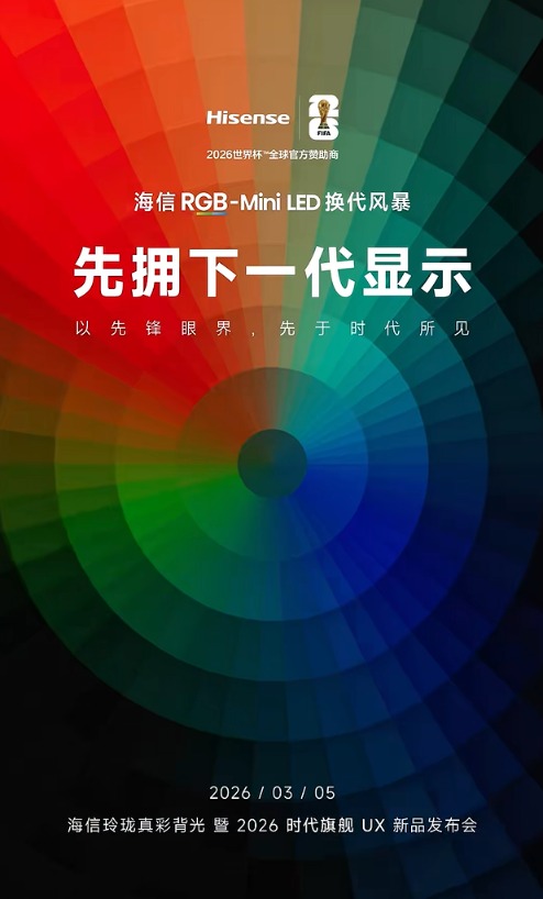 中证报中证网讯(记者张鹏飞)记者日前从海信方面获悉,海信RGB-Mini LED超旗舰电视UX2026款将于 2026年3月5日正式发布。 海信UX2026款新品可谓未发先火。今年1月初在CES2026上初次亮相就揽获17项国际大奖,凭借海信玲 珑四芯真彩背光、光色同控信芯AI画质芯片H7黑科技吸引热议。 2025年海信全球首发RGB-Mini LED电视UX后,全球头部电视品牌几乎全部跟进布局,RGB-Mini LED 也成为行业公认的全新一代显示技术。作为RGB-Mini LED电视的开创者和引领者,海信如何进一步解 封这项跨代技术的画质潜力,成为全球显示行业与消费者关注的焦点。 ...