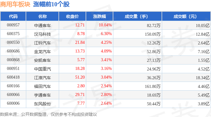 证券之星消息,10月13日商用车板块较上一交易日下跌1.35%,江淮汽车领跌。当日上证指数报收于 3889.5,下跌0.19%。深证成指报收于13231.47,下跌0.93%。商用车板块个股涨跌见下表: | 代码 | 名称 | 收盘价 | 涨跌幅 | 成交量(手) | 成交额(元) | | | --- | --- | --- | --- | --- | --- | --- | | 600686 | 金成汽车 | 13.49 | 4.74% | | 87.26万 | 11.67亿 | | 600066 | 宇通客车 | 29.71 | 1.05% | | 30.83万 | 9.21亿 | | 000868 | 安凯客车 | 5.57 | 0.36% | | 20.65万 | 1.13亿 | | 600303 | 曙光股份 | 3.90 | -0.26% | 1 | 33.83万 | 1.31亿 | | 000957 | 中通客车 | 11.36 | -0.61% | | 18.56万 | 2.10亿 | | 600375 | 汉马科技 | 8.16 | -0.73% | | 71.12万 | 5.77亿 | | ...