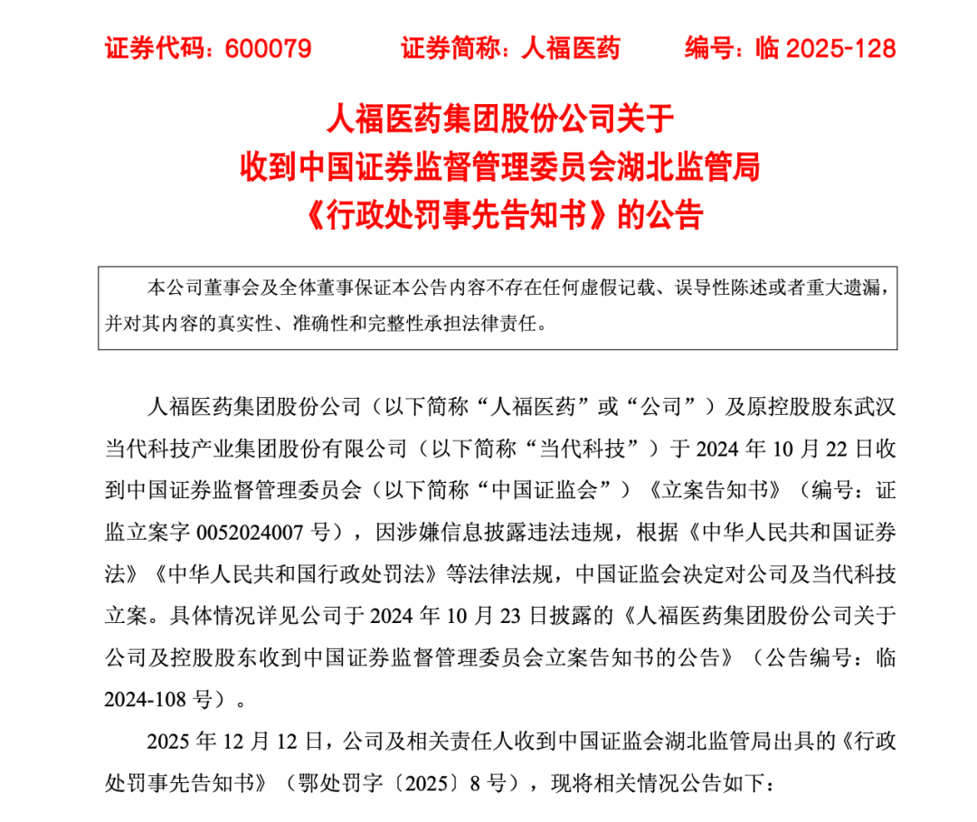 登录新浪财经APP 搜索【信披】查看更多考评等级 曾被誉为"麻醉一哥"的人福医药,在2025年岁末迎来一记重击。因年报财务数据虚假记载,公司收到湖 北证监局的《行政处罚事先告知书》,股票自12月15日起停牌,复牌后简称变更为"ST人福(维 权)"。这家营收连续多年超200亿元、在麻醉镇痛药市场占据绝对优势的医药龙头企业,为何一夜之间 被冠以ST帽子?其背后,是一场由大股东当代集团主导的资本游戏逐渐失控的故事。 一、暗雷引爆:财务造假与资金占用的双重冲击 人福医药此次被处罚,直接原因在于四项信息披露违规行为,涉及非经营性资金占用、关联交易未披 露、定期报告虚假记载及关联关系隐瞒。其中最触目惊心的是,2020年至2022年3月期间,在当代集团 的要求与安排下,人福医药累计发生非经营性资金占用127.85亿元。这些资金并未用于公司主营业务, 反而成为大股东的"提款机"。 令人深思的是,即便在违规期间,人福医药的核心业务表现依然亮眼——旗下麻醉药产品长期占据市场 八成以上份额,2024年营收突破250亿元,子公司宜昌人福净利润甚至超过母公司。优质的基本面与混 乱的公司治理形成鲜明对比,折射出上市公司在集团资本操控下的 ...