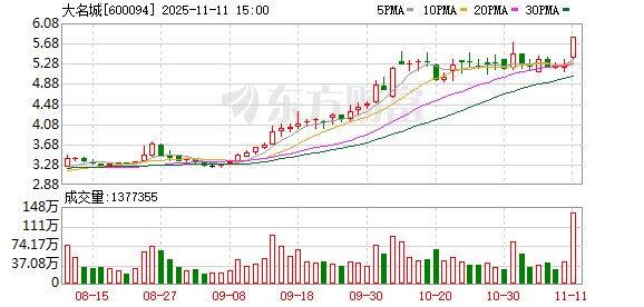 Core Viewpoint - The stock of Daming City (600094) experienced a trading halt today, with a significant increase in trading volume and fluctuations, indicating heightened market activity and investor interest [2]. Trading Activity - The stock reached a daily limit increase, with a turnover rate of 6.48% and a total transaction value of 7.81 billion yuan, showing a price fluctuation of 7.82% [2]. - The stock was listed on the Shanghai Stock Exchange due to a daily price deviation of 10.47%, with net selling from the Shanghai-Hong Kong Stock Connect amounting to 11.62 million yuan [2]. - The top five trading departments accounted for a total transaction value of 368 million yuan, with buying transactions totaling 148 million yuan and selling transactions totaling 219 million yuan, resulting in a net selling of 71.06 million yuan [2]. Fund Flow - The stock saw a net inflow of 19.99 million yuan from major funds today, with a significant inflow of 26.62 million yuan from large orders, while large orders experienced a net outflow of 6.62 million yuan [2]. - Over the past five days, the net inflow of major funds amounted to 19.24 million yuan [2]. Margin Trading - As of November 10, the margin trading balance for the stock was 800 million yuan, with a financing balance of 797 million yuan and a securities lending balance of 2.75 million yuan [2]. - Over the past five days, the financing balance increased by 36.29 million yuan, representing a growth of 4.77%, while the securities lending balance increased by 0.0784 million yuan, a growth of 2.94% [2]. Financial Performance - In the third quarter report released on October 28, the company reported a total revenue of 1.938 billion yuan for the first three quarters, a year-on-year decrease of 49.15%, while net profit reached 258 million yuan, reflecting a year-on-year increase of 10.66% [3].