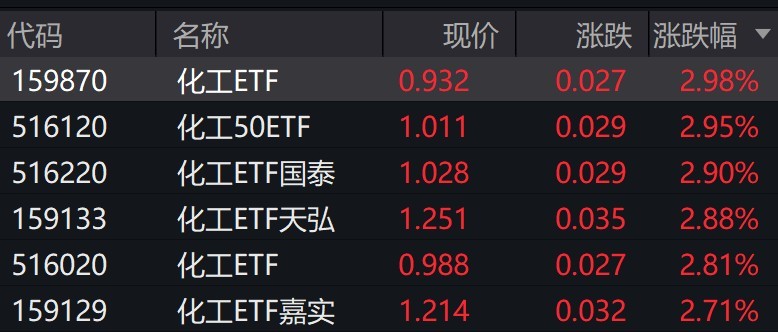 消息面上,化工品涨价再迎有利催化。农化链方面,春耕备肥逐步启动,化肥市场迎来传统需求旺季,近期国 内化肥价格出现结构性上涨;纺服链方面,每年的3月至4月期间,下游纺织企业集中采购化纤原料,以满足春 夏季节服装、家纺等产品的生产需求,低库存的化纤品种有望率先展现出价格弹性。 (文章来源:每日经济新闻) 化工概念股走强,恒力石化涨超6%,万华化学、云天化涨超4%。 受盘面影响,化工相关ETF涨近3%。 | 代码 | 名称 | 现价 | | 涨跌 涨跌幅 ▼ | | --- | --- | --- | --- | --- | | 159870 | 化工ETF | 0.932 | 0.027 | 2.98% | | 516120 | 化工50ETF | 1.011 | 0.029 | 2.95% | | 516220 | 化工ETF国泰 | 1.028 | 0.029 | 2.90% | | 159133 | 化工ETF天弘 | 1.251 | 0.035 | 2.88% | | 516020 | 化工ETF | 0.988 | 0.027 | 2.81% | | 159129 | 化工ETF嘉实 | 1.214 | ...