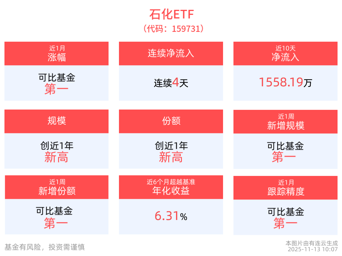 截至2025年11月13日10:07,中证石化产业指数上涨0.98%,成分股联泓新科一字涨停,藏格矿业上涨6.30%,盐湖股份上涨6.06%,兴发集团上涨5.80%,云 天化上涨3.52%。石化ETF(159731)上涨0.95%,最新价报0.85元。拉长时间看,截至2025年11月12日,石化ETF近1周累计上涨6.83%。 截至11月12日,石化ETF近6月净值上涨27.44%。从收益能力看,截至2025年11月12日,石化ETF自成立以来,最高单月回报为15.86%,最长连涨月数为6个 月,最长连涨涨幅为23.51%,上涨月份平均收益率为5.06%。截至2025年11月12日,石化ETF近6个月超越基准年化收益为6.31%。 石化ETF紧密跟踪中证石化产业指数,数据显示,截至2025年10月31日,中证石化产业指数前十大权重股分别为万华化学、中国石油、盐湖股份、中国石 化、中国海油、巨化股份、藏格矿业、金发科技、宝丰能源和华鲁恒升,前十大权重股合计占比56.05%。 | 股票代码 | 股票简称 | 涨跌幅 | 权重 | | --- | --- | --- | --- | | 600309 | 万华化学 ...