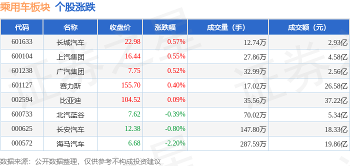 | 代码 | 名称 | 主力净流入 (元) | 主力净占比 游资净流入 (元) | | 游资净占比 散户净流入 (元) | | 散户净占比 | | --- | --- | --- | --- | --- | --- | --- | --- | | 600104 上汽集团 | | 1877.56万 | 4.10% | -2206.70万 | -4.82% | 329.14万 | 0.72% | | 601633 长城汽车 | | 1505.08万 | 5.14% | -803.42万 | -2.75% | -701.66万 | -2.40% | | 601238 广汽集团 | | 1107.38万 | 4.33% | 54.35万 | 4 0.21% | -1161.73万 | -4.54% | | 600733 北汽蓝谷 | | -1418.81万 | -2.65% | 1843.19万 | 3.45% | -424.38万 | -0.79% | | 601127 赛力斯 | | -6351.61万 | -2.39% | 1672.43万 | 0.63% | 4679.18万 | 1.76% | | 0005 ...