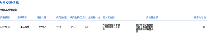 | 及景垒立日志 | | | | | | | | --- | --- | --- | --- | --- | --- | --- | | 交易日期 | 证券简称 | 证券代码 | 成交价(元) 成交金额(万元) 成交量( *) 买入营业部 | | | 奥出营业部 是否为专场 | | 026-01-27 | 重庆路桥 | 600106 | 6.41 641 | 100 | 感商量获繫學有想 | Ka 超精髓 | 1月27日,重庆路桥大宗交易成交100万股,成交额641万元,占当日总成交额的5.91%,成交价6.41元, 较市场收盘价6.44元折价0.47%。 ...