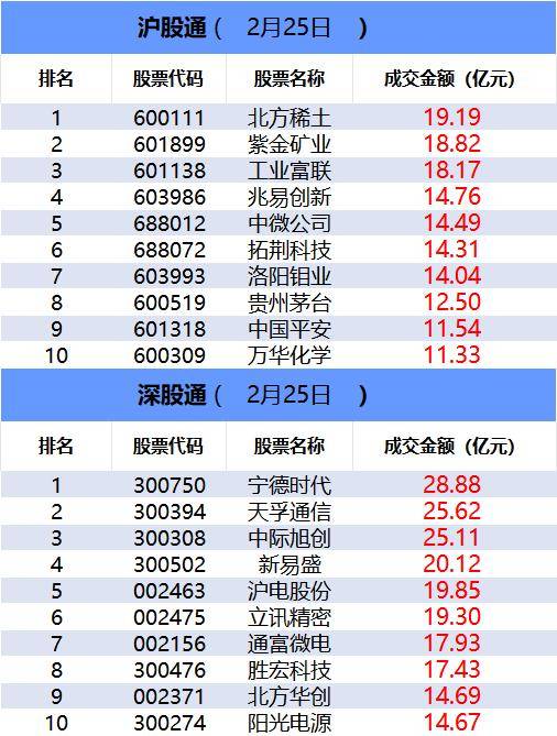 转自:智通财经 沪深股通今日合计成交3195.37亿,其中北方稀土和宁德时代分居沪股通和深股通个股成交额首位。板 块主力资金方面,有色金属板块主力资金净流入居首。ETF成交方面,巴西ETF易方达(520870)成交 额环比增长489%。 龙虎榜方面,通源石油今日冲高回落,获五家机构买入3.85亿,同时遭两家一线游资(国泰海通证券上 海中山东路、国泰海通证券成都北一环路)合计卖出1.38亿。东岳硅材强势涨停,获一家量化资金(开 源证券西安太华路)买入1.02亿,一家一线游资(国泰海通证券成都北一环路)买入0.59亿。 一、沪深股通前十大成交 今日沪股通总成交金额为1513.17亿,深股通总成交金额为1682.2亿。 | | 沪股道( | 2月25日 | | | --- | --- | --- | --- | | 排名 | 股票代码 | 股票名称 | 成交金额(亿元) | | 1 | 600111 | 北方株士 | 19.19 | | 2 | 601899 | 三十四年第 | 18.82 | | 3 | 601138 | 工业富联 | 18.17 | | ਪ | 603986 | 北易创新 | 14.76 | | ...