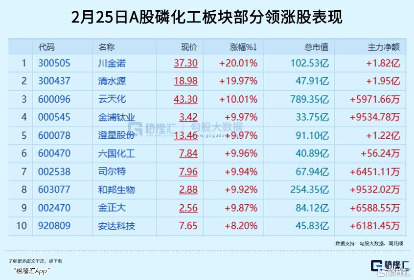 01 磷化工上演"王炸"行情 化工板块今日延续强势,磷化工概念股成为全场最靓的"仔"。 盘中时段,澄星股份强势2连板,川金诺、清水源双双20cm涨停,川发龙蟒、云天化、司尔特封死10cm涨停板,湖北宜 化、兴发集团、川恒股份大涨超6%。 周期股又杀疯了! 2月25日,截至A股收盘,三大指数集体上攻,上证指数上涨0.72%,报4147.23点,深成指涨1.20%,创业板指涨1.1%,全 市场近3800个股飘红,100股涨停。 表现最亮眼的是周期品涨价主线——贵金属、有色、化工、建材等多板块轮番上攻,澄星股份强势2连板,川金诺、清水 源双双录得20cm涨停;有色金属板块更疯狂,北方稀土、锡业股份、驰宏锌锗、云南锗业、章源钨业等20余只个股集体 封板;油气航运板块中,中远海能、招商轮船两大千亿巨头盘中四天三板,通源石油涨超18%…… 很显然,这场周期品种的涨价狂欢行情已席卷整个周期板块,正成为贯穿全场的强势投资主线。 这场磷化工暴涨行情的最直接导火索,来自美国的一纸行政令—— | | 代码 | 名称 | 现价 | 张幅%1 | 总市值 | 部力净额 | | --- | --- | --- | --- | --- | ...
