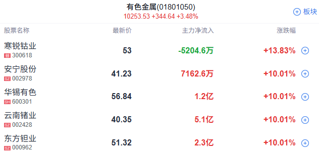 2月25日,A股市场高开高走,午后小幅回落后再度拉升,创业板指、深成指均涨超1%。截至收盘,沪 指涨0.72%,深成指涨1.29%,创业板指涨1.41%。沪深两市成交额2.46万亿,较上一个交易日放量2605 亿。 1、有色金属板块走高 小金属、贵金属等有色板块大涨,东方钽业、华锡有色、中钨高新等多股涨停。 | | | 有色金属(01801050) 10253.53 +344.64 +3.48% | + 板块 | | --- | --- | --- | --- | | 股票名称 | 最新价 | 主力净流入 | 涨跌幅 | | 寒锐钻业 300618 | 53 | -5204.6万 | +13.83% (+) | | 安宁股份 sz 002978 | 41.23 | 7162.6万 | +10.01% (+) | | 华锡有色 SH 600301 | 56.84 | 1.2亿 | +10.01% + | | 云南错业 sz 002428 | 40.35 | 5.1亿 | +10.01% + | | 东方锂业 sz 000962 | 51.32 | 2.3亿 | +10.01% + | 点评:中银证券发布研报称, ...