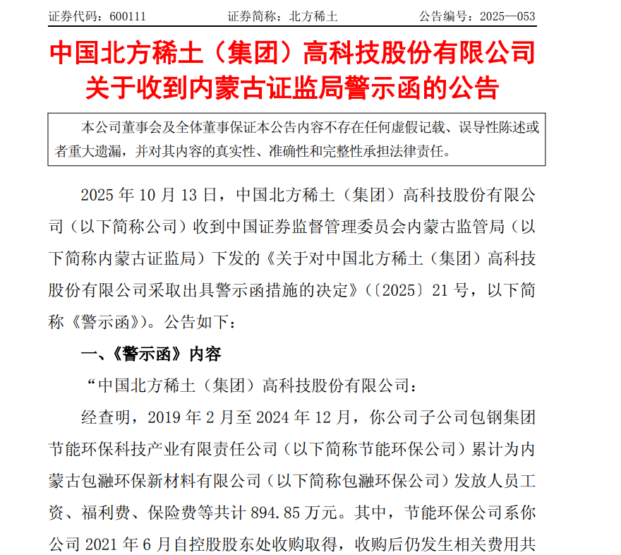 Core Viewpoint - Northern Rare Earth (600111) received a warning letter from the Inner Mongolia Securities Regulatory Bureau due to the occupation of funds by related parties and failure to fulfill information disclosure obligations [1][5]. Group 1: Regulatory Actions - From February 2019 to December 2024, Northern Rare Earth's subsidiary, Baogang Group Energy Conservation and Environmental Protection Technology Co., Ltd., paid a total of 8.9485 million yuan in wages, benefits, and insurance for the controlling shareholder's subsidiary, Inner Mongolia Baolan Environmental Protection New Materials Co., Ltd. [5] - The warning letter identified this behavior as non-operating fund occupation by related parties, and Northern Rare Earth did not disclose this matter as required [5]. - On October 10, the Shanghai Stock Exchange had already issued a regulatory warning to Northern Rare Earth and its related party, requiring them to take effective measures to rectify the violations [6]. Group 2: Company Response - Northern Rare Earth stated that it takes the issues raised in the warning letter seriously and will strengthen the study of relevant laws and regulations, improve internal management, and enhance the quality of information disclosure to prevent similar incidents in the future [8]. - The company emphasized that the administrative regulatory measures will not affect its normal business operations [8]. Group 3: Market Reaction - On October 13, amidst a surge in the rare earth sector, Northern Rare Earth's stock hit the daily limit, with a trading volume of approximately 21.5 billion yuan, making it the top stock by trading volume on that day in the Shanghai and Shenzhen markets [8].