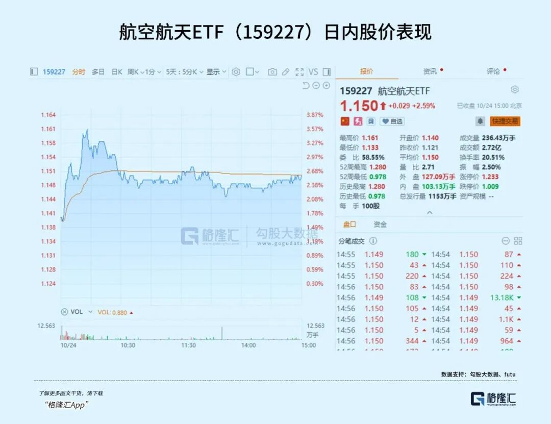 未来五年的金矿题材来了! 10月24日,随着重大会议公报的发布,以及关于"十五五规划建议"的内容被广泛讨论关注,A股市场也做出了积极的反应。 截至收盘,A股三大指数集体走高,沪指收涨0.71%报3950点并续创10年新高,深证成指涨2.02%,创业板指涨3.57%,科创50指数涨4.35%。 板块上,AI、芯片半导体、卫星、军工、航天、服务器等各种硬科技产业链概念板块集体爆发。其中"含航量最高"的航空航天ETF(159227)放量大涨 2.59%,成交额较昨日激增2倍,盘中预估获超1.3亿资金净申购。 集体领涨 今天,军工及航天板块是除芯片半导体产业链之外,表现最强的核心热点方向。 航天智装今日强势一字板斩获20CM涨幅,航天环宇、中国卫星、航天长峰、上海沪工、中天火箭等多股强势涨停。 数据显示,今日国防军工板块主力净流入超40亿元,其中航空航天ETF(159227)同样净流入明显,目前已连续5日获得资金净流入,年内份额大增7.74亿 份,增长率高达183.45%,稳居同标的第一。 消息方面,10月23日晚,四中全会公报正式发布。相较于十九届五中全会公报,全会对"十五五"时期经济社会发展的主要目标中,着重提出 ...