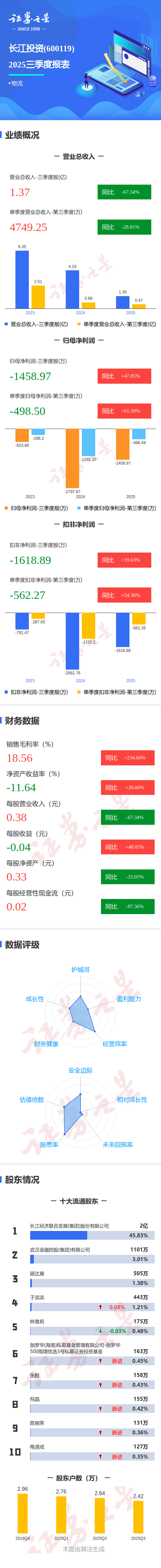 智通财经APP讯,长江投资(600119.SH)披露2025年第三季度报告,公司前三季度实现营收1.37亿元,同 比下降67.35%;归母净利润亏损1459万元;扣非净利润亏损1619万元;基本每股收益-0.04元。 ...