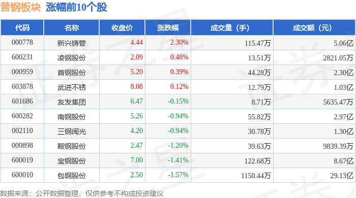 证券之星消息,1月16日普钢板块较上一交易日下跌1.53%,杭钢股份领跌。当日上证指数报收于 4101.91,下跌0.26%。深证成指报收于14281.08,下跌0.18%。普钢板块个股涨跌见下表: | 代码 | 名称 | 收盘价 | 涨跌幅 | 成交量(手) | 成交额(元) | | | --- | --- | --- | --- | --- | --- | --- | | 000778 | 新兴铸管 | 4.44 | 2.30% | 115.47万 | | 5.06亿 | | 600231 | 凌钢股份 | 2.09 | 0.48% | 13.51万 | 2821.05万 | | | 000959 | 首钢股份 | 5.20 | 0.39% | 44.28万 | | 2.30亿 | | 603878 | 武进不锈 | 8.08 | 0.12% | 12.79万 | | 1.03亿 | | 601686 | 友发集团 | 6.47 | -0.15% | 8.71万 | 5635.47万 | | | 600282 | 南钢股份 | 5.26 | -0.94% | 55.82万 | | 2.97亿 | | 00 ...
