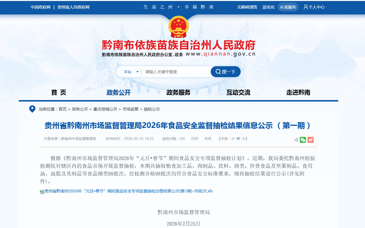 贵州省黔南州市场监督管理局2026年食品安全监督抽检结果信息公示 (第一期)