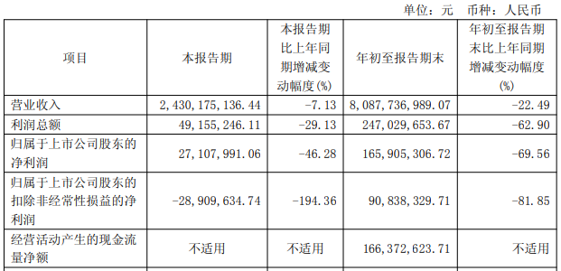 太极集团(600129.SH)发布前三季度业绩,归母净利润1.66亿元,同比下降69.56%