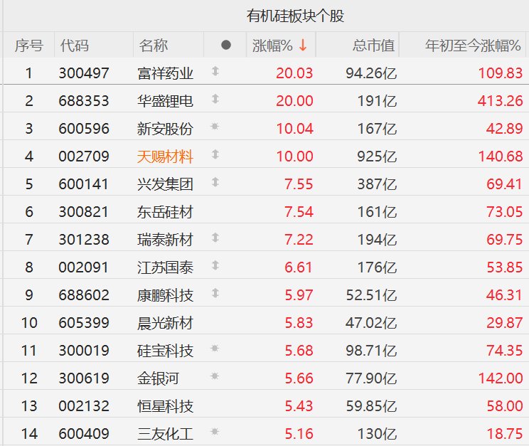 3分钟便捷开户,把握投资先机!长江证券三大尊享福利>> | | | | | 有机硅板块个股 | | | | --- | --- | --- | --- | --- | --- | --- | | 序号 代码 | | 名称 | | 涨幅% ↓ | 总市值 | 年初至今涨幅% | | 1 | 300497 | 富祥药业 | 1 | 20.03 | 94.26亿 | 109.83 | | 2 | 688353 | 华盛博电 | 1 | 20.00 | 191亿 | 413.26 | | 3 | 600596 | 新安股份 | 兼 | 10.04 | 167亿 | 42.89 | | ব | 002709 | 天赐材料 | 1 | 10.00 | 925 Z | 140.68 | | 5 | 600141 | 兴发集团 | 1 | 7.55 | 387亿 | 69.41 | | 6 | 300821 | 东岳硅材 | | 7.54 | 161亿 | 73.05 | | 7 | 301238 | 瑞泰新材 | + | 7.22 | 194Z | 69.75 | | 8 | 002091 | 江苏国泰 | 1 | 6.6 ...