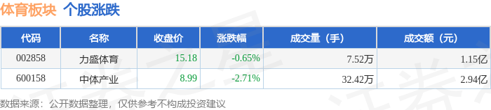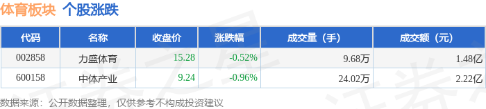 Group 1 - The sports sector increased by 0.67% compared to the previous trading day, with Zhongti Industry leading the gains [1] - On the same day, the Shanghai Composite Index closed at 3960.19, down 0.41%, while the Shenzhen Component Index closed at 13175.22, down 1.71% [1] - Zhongti Industry's closing price was 9.44, with a rise of 0.75%, and Lisheng Sports closed at 14.98, up 0.33% [1] Group 2 - The net outflow of main funds in the sports sector was 7.34 million yuan, while retail investors saw a net inflow of 6.80 million yuan [1] - For Zhongti Industry, the main net inflow was 653,900 yuan, while for Lisheng Sports, there was a net outflow of 7.99 million yuan [1] - Retail investors accounted for a net inflow of 755.09 million yuan in Lisheng Sports, indicating strong retail interest despite the overall outflow [1]
