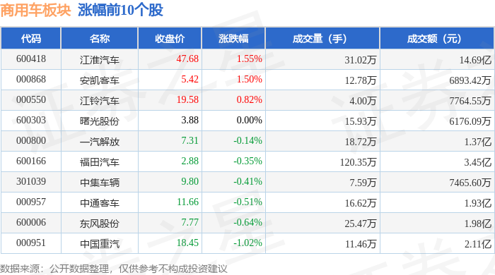 证券之星消息,11月10日商用车板块较上一交易日下跌0.28%,宇通客车领跌。当日上证指数报收于4018.6,上涨0.53%。深证成指报收于 13427.61,上涨0.18%。商用车板块个股涨跌见下表: | 代码 | 名称 | 收盘价 | 涨跌幅 | 成交量(手) | 成交额(元) | | --- | --- | --- | --- | --- | --- | | 600418 | 江淮汽车 | 47.68 | 1.55% | 31.02万 | 14.69亿 | | 000868 | 安凯客车 | 5.42 | 1.50% | 12.78万 | 6893.42万 | | 000550 | 江铃汽车 | 19.58 | 0.82% | 4.00万 | 7764.55万 | | 600303 | 曙光股份 | 3.88 | 0.00% | 15.93万 | 6176.09万 | | 000800 | 一汽解放 | 7.31 | -0.14% | 18.72万 | 1.37亿 | | 600166 | 福田汽车 | 2.88 | -0.35% | 120.35万 | 3.45亿 | | 301039 | 中集车辆 ...