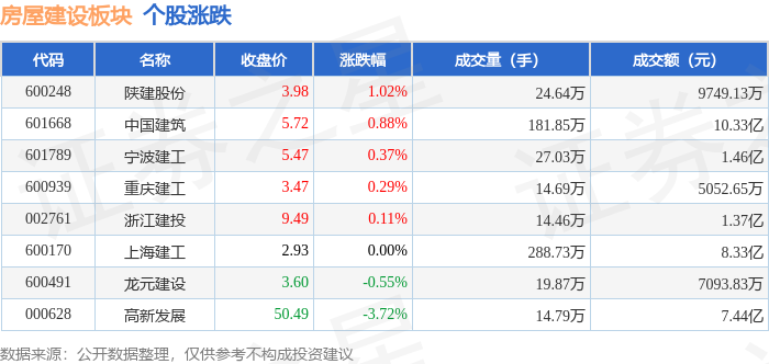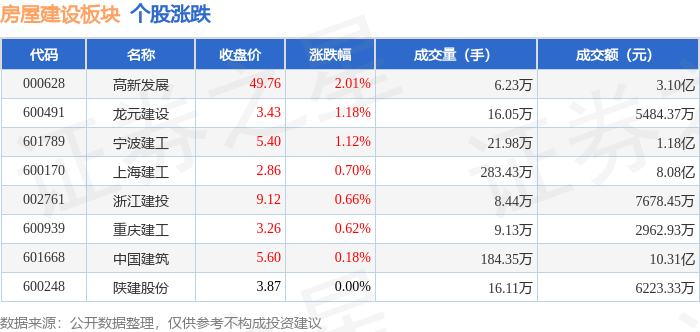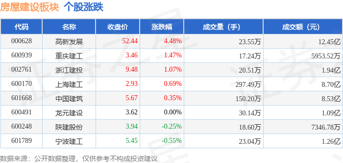 证券之星消息,10月20日房屋建设板块较上一交易日上涨0.33%,高新发展领涨。当日上证指数报收于 3863.89,上涨0.63%。深证成指报收于12813.21,上涨0.98%。房屋建设板块个股涨跌见下表: | 代码 | 名称 | 收盘价 | 涨跌幅 | 成交量(手) | 成交额(元) | | --- | --- | --- | --- | --- | --- | | 000628 | 高新发展 | 49.76 | 2.01% | 6.23万 | 3.10亿 | | 600491 | 龙元建设 | 3.43 | 1.18% | 16.05万 | 5484.37万 | | 601789 | 宁波建工 | 5.40 | 1.12% | 21.98万 | 1.18亿 | | 600170 | 上海建工 | 2.86 | 0.70% | 283.43万 | 8.08亿 | | 002761 | 浙江建投 | 9.12 | 0.66% | 8.44万 | 7678.45万 | | 600939 | 重庆建工 | 3.26 | 0.62% | 9.13万 | 2962.93万 | | 601668 | 中国建筑 | 5 ...