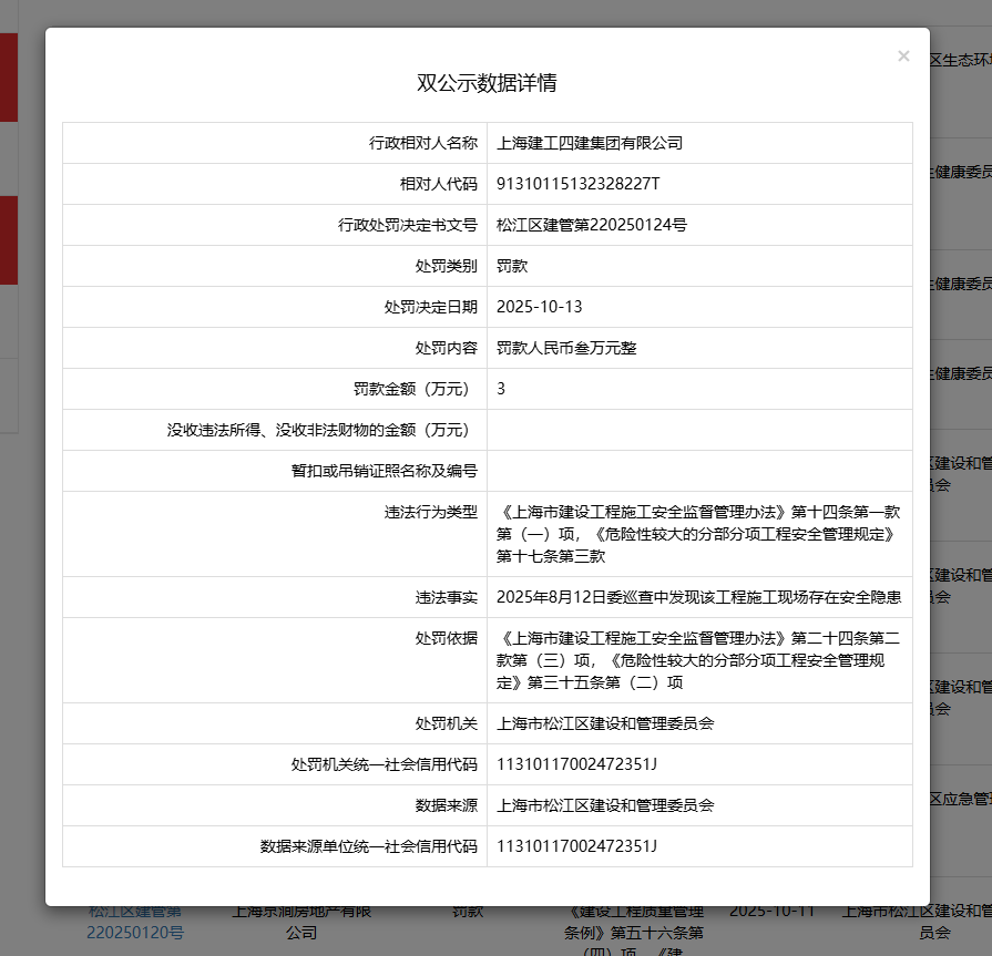 近日,齐鲁晚报·齐鲁壹点记者从信用中国(上海)获悉,上海建工四建集团有限公司因工程施工现场存在安全隐患,被上海市 松江区建设和管理委员会罚款3万元。 | 双公示数据详情 | | | | | --- | --- | --- | --- | | 行政相对人名称 | | 上海建工四建集团有限公司 | | | 相对人代码 | | 91310115132328227T | | | 行政处罚决定书文号 | | 松江区建管第220250124号 | | | 罚款 | 处罚类别 | | | | 2025-10-13 | 处罚决定日期 | | | | 处罚内容 | | 罚款人民币叁万元整 | | | 罚款全额 (万元) | | 3 | | | 没收违法所得、没收非法财物的金额(万元) | | | | | 暂扣或吊销证照名称及编号 | | | | | 违法行为类型 | | 《上海市建设工程施工安全监督管理办法》第十四条第一款 第 (一)项,《危险性较大的分部分项工程安全管理规定》 第十七条第三款 | | | 违法事实 | | 2025年8月12日委巡查中发现该工程施工现场存在安全隐患 | | | 处罚依据 | | 《上海市建设工 ...
