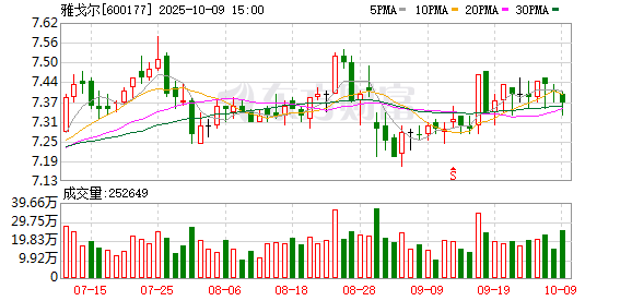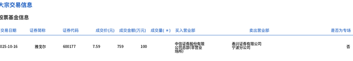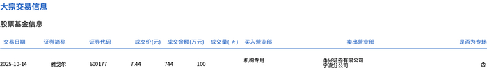 10月14日,雅戈尔大宗交易成交100万股,成交额744万元,占当日总成交额的2.74%,成交价7.44元, 较市场收盘价7.49元折价0.67%。 | 2025-10-14 | 雅戈尔 | 600177 | 7.44 7.44 100 | 机构专用 | 要送景观看限公司 | Ka | | --- | --- | --- | --- | --- | --- | --- | | 交易日期 证券简称 | | 蓬券代码 -- | 成交价(元) 成交金额(万元) 成交量(*) 买入营业部 | | 卖出营业部 | 是否为专场 | ...