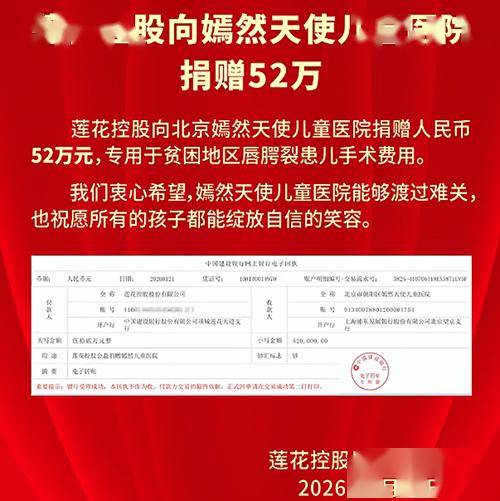 据悉,嫣然天使儿童医院是一家由李亚鹏和王菲在2012年共同发起创办的民办非营利性儿童综合医院 ,专门致力于为唇腭裂等先天性缺陷患儿提供医疗救助。近期,医院陷入关停危机,得到社会各界爱心 支援。 中证报中证网讯(记者 王佳飞 熊永红)1月21日,莲花控股(600186)向面临运营困境的北京市朝阳区 嫣然天使儿童医院定向捐赠善款52万元,该笔善款将专项用于唇腭裂儿童的医疗救助与康复支持工作, 以帮助更多贫困家庭儿童获得专业诊疗服务。 莲花控股表示,多年来公司积极履行上市公司社会责任,广泛参与救灾、抗疫、扶贫、助学等公益事 业,连续多年荣获"河南省食品行业履行社会责任优秀企业"称号,今后公司将继续努力为经济社会和谐 健康发展作出贡献。 ...