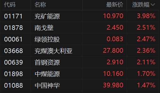消息上,浙商证券发布研报称,三季度蒙煤进口量触底回升,供应链贸易利润亦随着价格反弹实现触底 反弹。在国内"反内卷"大环境下,铁水产量维持高位,若煤炭行业继续推进"查超产",有望维持焦煤供 需格局紧平衡,对焦煤价格形成支撑,蒙煤贸易企业利润空间有望修复。推荐嘉友国际,建议关注易大 宗等。 10月14日,港股煤炭股普遍上涨,其中,兖矿能源涨4%,南戈壁、绿领控股涨2.5%,兖煤澳大利亚、 首钢资源涨超2%,中煤能源涨1.7%,中国神华涨超1%。 | 代码 | 名称 | 最新价 | 涨跌幅 ▽ | | --- | --- | --- | --- | | 01171 | 究矿能源 | 10.970 | 3.98% | | 01878 | 南戈壁 | 2.450 | 2.51% | | 00061 | 绿领控股 | 0.083 | 2.47% | | 03668 | 兖煤澳大利亚 | 27.800 | 2.36% | | 00639 | 首钢资源 | 2.910 | 2.11% | | 01898 | 中煤能源 | 10.160 | 1.70% | | 01088 | 中国神华 | 39.980 | 1.47% | 责 ...