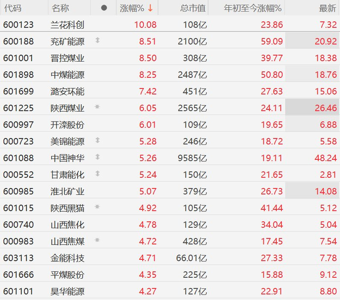| 代码 | 名称 | | 涨幅% ↓ | 总市值 | 年初至今涨幅% | 最新 | | --- | --- | --- | --- | --- | --- | --- | | 600123 | 兰花科创 | | 10.08 | 108亿 | 23.86 | 7.32 | | 600188 | 発矿能源 | 1 | 8.51 | 2100亿 | 59.09 | 20.92 | | 601001 | 晋控煤业 | | 8.50 | 308亿 | 39.77 | 18.38 | | 601898 | 中煤能源 | | 8.25 | 2487亿 | 50.80 | 18.76 | | 601699 | 潞安环能 | | 7.42 | 451亿 | 27.63 | 15.06 | | 601225 | 陕西煤业 | -0. | 6.05 | 2565 Z | 24.11 | 26.46 | | 600997 | 开滦股份 | | 6.01 | 109亿 | 19.65 | 6.88 | | 000723 | 美锦能源 | 1 | 5.28 | 246亿 | 18.72 | 5.58 | | 601088 | 中国神华 ...