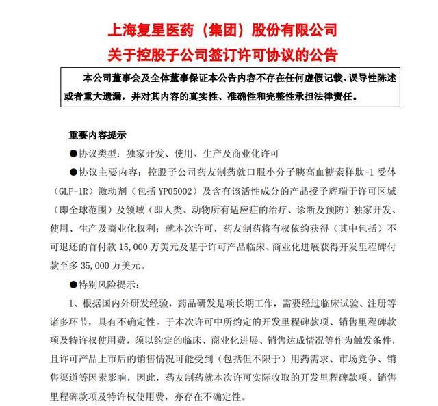 复星医药(600196)(600196.SH)发布公告,2025年12月9日,公司控股子公司药友制药、复星医药产业 与辉瑞共同签订《许可协议》,(其中主要包括)由药友制药就口服小分子胰高血糖素样肽-1受体(GLP- 1R)激动剂(包括YP05002)及含有该活性成分的产品授予辉瑞于许可区域(即全球范围)及领域(人类、动物 所有适应症的治疗、诊断及预防)独家开发、使用、生产及商业化权利;就本次许可,药友制药将有权依 约获得(其中包括)不可退还的首付款1.5亿美元及基于许可产品临床、商业化进展获得开发里程碑付款至 多3.5亿美元。此外,基于许可产品的年度净销售额达成情况,由辉瑞向药友制药依约支付至多15.85亿 美元的销售里程碑款项。 YP05002为集团自主研发并拥有自主知识产权的口服小分子胰高血糖素样肽-1受体(GLP-1R)激动剂;其主 要通过激活人的GLP-1R,促进胰腺的胰岛素分泌和降低胰高血糖素分泌,在胃肠道抑制胃排空和肠道 的蠕动,并通过影响中枢抑制食欲减少能量的摄入等机制,用于治疗2型糖尿病、肥胖症及其相关疾病。 YP05002拟用于代谢领域相关疾病的治疗,潜在适应症包括但不限于长期体重管理、2型 ...