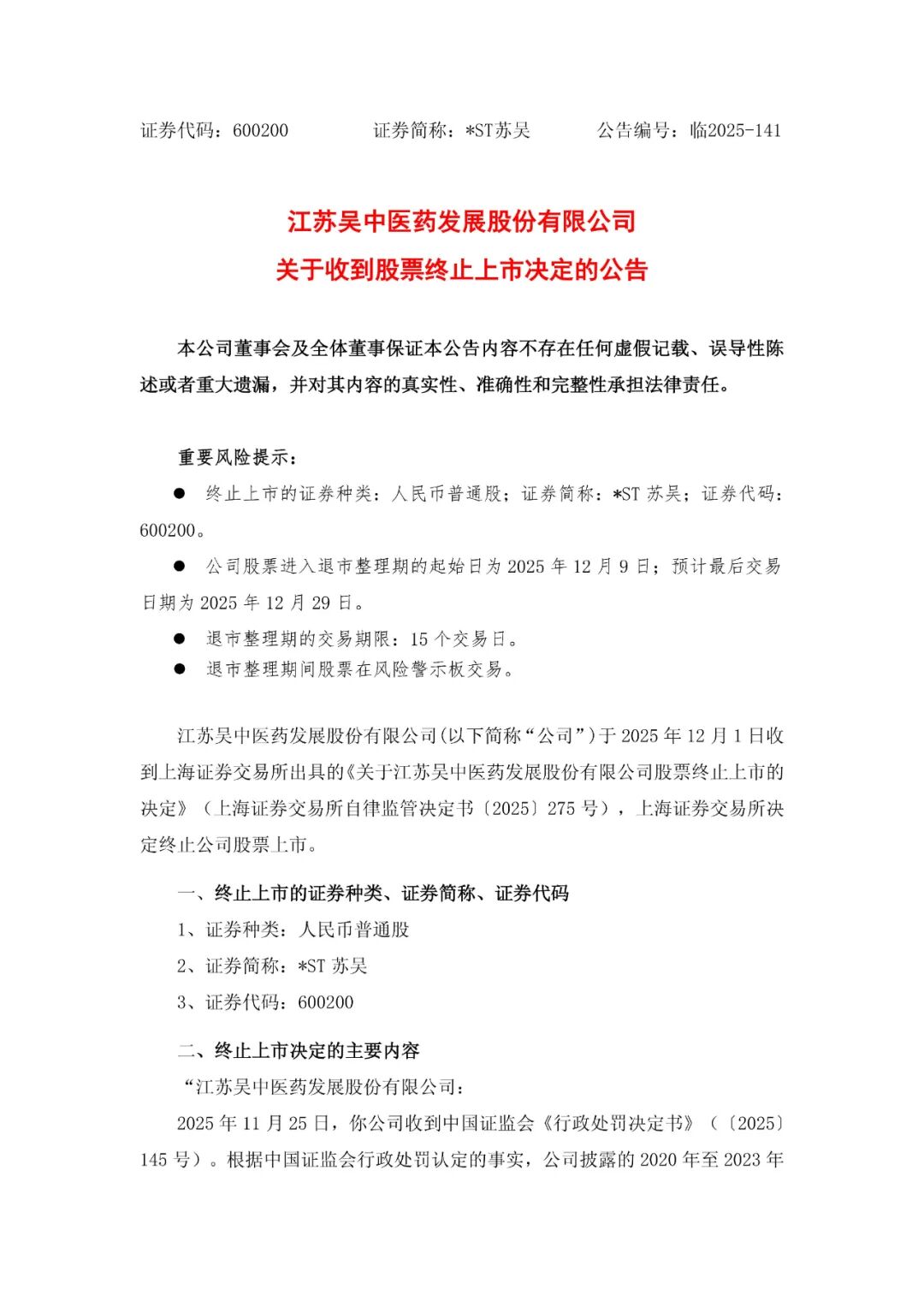 根据此前公告,由于未如实披露实际控制人,虚增营业收入、营业成本和利润,未按规定披露关联方非 经营性占用资金情况等,上交所11月25日披露公告,对*ST苏吴、实际控制人暨时任董事长钱群山及有 关责任人予以纪律处分。 中国经济网12月2日讯12月2日,江苏吴中医药发展股份有限公司(下称*ST苏吴(600200))披露公告, 由于公司年报连续4年存在虚假记载,上交所终止公司股票上市。公司股票进入退市整理期的起始日为 2025年12月9日,预计最后交易日期为2025年12月29日。公司股票终止上市后,将转入全国中小企业股 份转让系统进行股份转让。 公告显示,早在今年2月,因涉嫌信息披露违法违规,中国证监会对*ST苏吴立案。11月25日,中国证 监会向其出具《行政处罚决定书》。根据中国证监会行政处罚认定的事实,该公司披露的2020年至2023 年年度报告存在虚假记载,情形属于《上海证券交易所股票上市规则(2025年4月修订)》规定中重大违 法强制退市情形。 ...