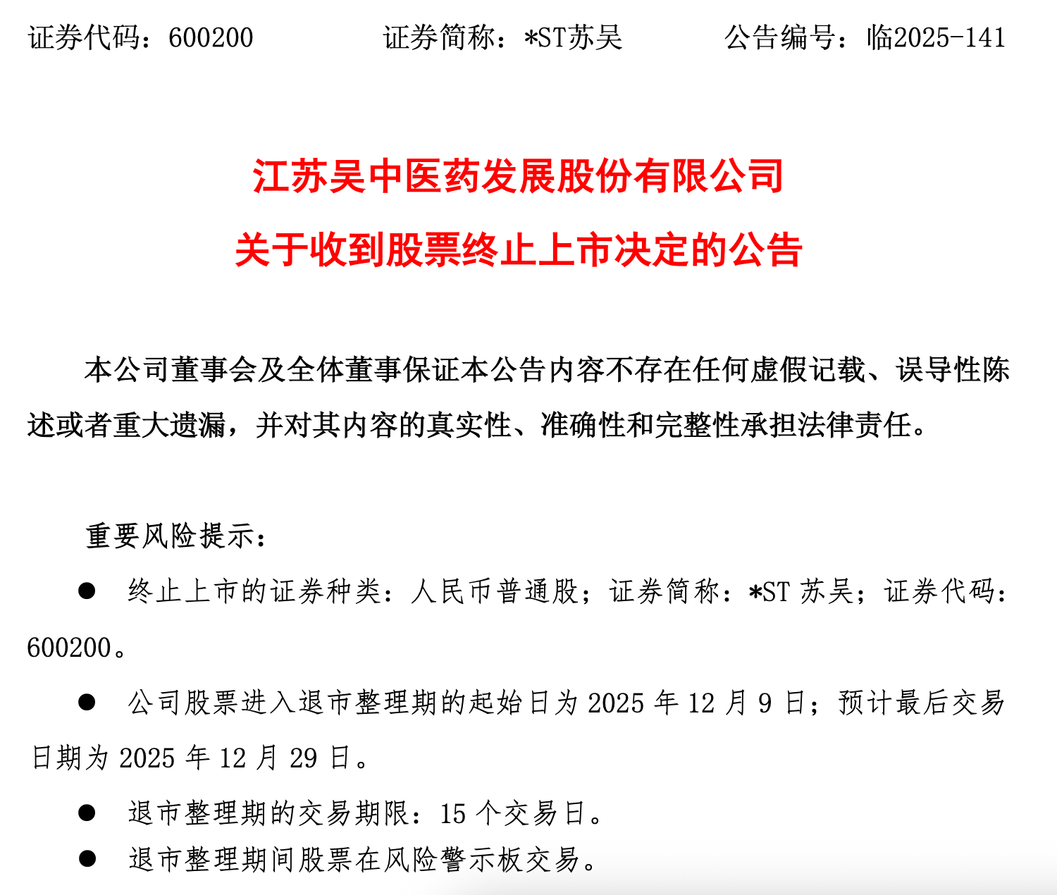 12月1日晚,江苏吴中医药发展股份有限公司(证券简称"*ST苏吴(600200)")发布公告称,公司收到上海证券交易所出具的《关于江苏吴中医药发展股份 有限公司股票终止上市的决定》,上交所决定终止公司股票上市。 证券代码:600200 == 证券简称:*ST苏吴 公告编号:临2025-141 江苏吴中医药发展股份有限公司 关于收到股票终止上市决定的公告 本公司董事会及全体董事保证本公告内容不存在任何虚假记载、误导性陈 述或者重大遗漏,并对其内容的真实性、准确性和完整性承担法律责任。 重要风险提示: 3、证券代码:600200 二、终止上市决定的主要内容 ● 终止上市的证券种类:人民币普通股;证券简称:*ST 苏吴;证券代码: 600200。 ● 公司股票进入退市整理期的起始日为2025年12月9日;预计最后交易 日期为 2025年 12月 29 日。 ● 退市整理期的交易期限:15个交易日。 ● 退市整理期间股票在风险警示板交易。 江苏吴中医药发展股份有限公司(以下简称"公司")于2025年12月1日收 到上海证券交易所出具的《关于江苏吴中医药发展股份有限公司股票终止上市的 决定》(上海证券交易所自律监管决定 ...