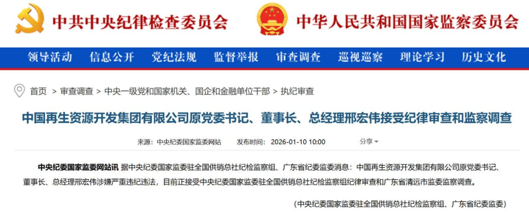 Group 1 - The former chairman and general manager of China Recycled Resources Group, Xing Hongwei, is under investigation for serious violations of discipline and law [1][15][24] - Xing Hongwei's resignation from all positions at China Recycled Resources Group occurred on December 19, 2025, due to personal reasons, which has been interpreted as a "naked resignation" [5][21][25] - The company stated that Xing's resignation would not affect its normal operations or management [9][23] Group 2 - China Recycled Resources Group, established in 1989, plays a crucial role in the development of the recycling industry and is under the auspices of the All-China Federation of Supply and Marketing Cooperatives, with an annual sales revenue of approximately 60 billion yuan and a processing capacity of over 30 million tons of recycled resources [10][24] - China Recycled Resources Environment Co., Ltd. (referred to as "China Recycled Resources Environment") is the publicly listed subsidiary of China Recycled Resources Group, with a registered capital of about 1.658 billion yuan and a market value of 6.946 billion yuan as of January 9, 2026 [10][24] - For the first three quarters of 2025, China Recycled Resources Environment reported a revenue of 2.449 billion yuan, a decrease of 15.56% year-on-year, and a net profit attributable to shareholders of -373 million yuan, indicating a shift from profit to loss [10][24]
