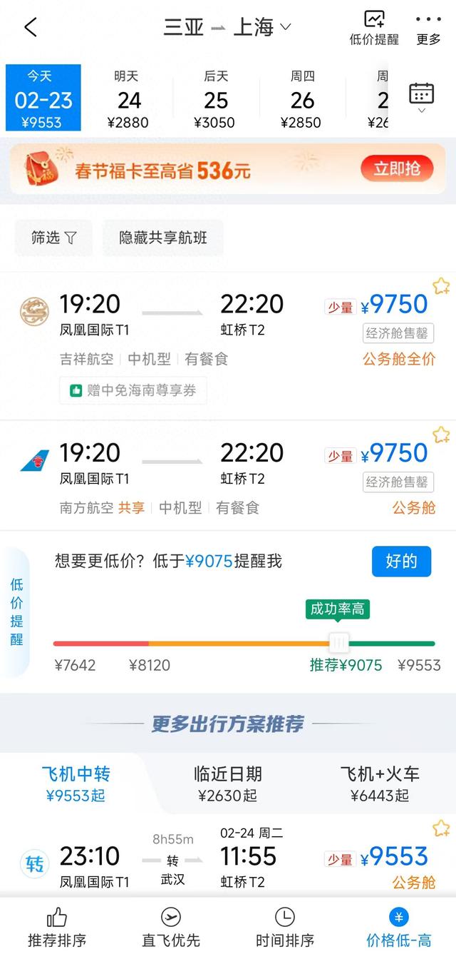 每经编辑|许绍航 据智通财经2月22日报道,多家在线旅游平台数据发现,2月22日至23日(初六至初七)期间,从三亚飞往北京、上海等核心城市的直飞航班经济舱几乎售 罄,仅剩的公务舱票价普遍逼近万元大关。 | 单程:三亚(凤凰国际机场)-上海 02月23日周一 | | | | | | | | | | 最近更新时间: 13:36:41 0 | | --- | --- | --- | --- | --- | --- | --- | --- | --- | --- | --- | | ■ 直飞/经停 航空公司 V | 起抵时间 | 0 机场 > | 舱位 √ | 更多 √ | 清空 | | 低价优先 | 准点率高-低 | 起飞时间早-晚 | | | 东方航空 | | 20:40 | | 23:25 | | | | 12450 915 11 4 | ¥9780 € | | | MU5376 波音787(大) | | 凤凰国际机场 T1 | | 虹桥国际机场 T2 | | | | | 公务舱 | | | 东方航空 | | 12:05 | | 15:00 | | | | 膜系的接关机券 | ¥9750 == | | | MU ...