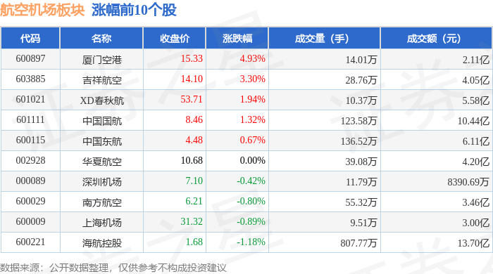| 代码 | 名称 | 收盘价 | 涨跌幅 | 成交量(手) | 成交额(元) | | | --- | --- | --- | --- | --- | --- | --- | | 000099 | 中信海直 | 21.48 | -2.85% | 16.60万 | | 3.63亿 | | 600004 | 白云机场 | 9.47 | -1.46% | 17.54万 | | + 1.67亿 | | 600221 | 海航控股 | 1.68 | -1.18% | 807.77万 | | 13.70亿 | | 600009 | 上海机场 | 31.32 | -0.89% | 9.51万 | | 3.00亿 | | 600029 | 南方航空 | 6.21 | -0.80% | 55.32万 | | 3.46亿 | | 000089 | 深圳机场 | 7.10 | -0.42% | 11.79万 | | 8390.69万 | | 002928 | 华夏航空 | 10.68 | 0.00% | 39.08万 | | 4.20亿 | | 600115 | 中国东航 | 4.48 | 0.67% | 136.52万 | | ...