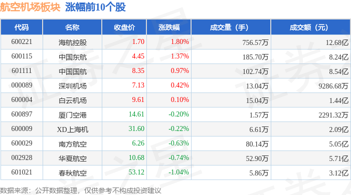证券之星消息,10月16日航空机场板块较上一交易日上涨0.01%,海航控股领涨。当日上证指数报收于 3916.23,上涨0.1%。深证成指报收于13086.41,下跌0.25%。航空机场板块个股涨跌见下表: 从资金流向上来看,当日航空机场板块主力资金净流入7716.5万元,游资资金净流出2.73亿元,散户资金 净流入1.96亿元。航空机场板块个股资金流向见下表: | 代码 | 名称 | 主力净流入(元) | 主力净占比 游资净流入 (元) | | 游资净占比 散户净流入 (元) | | 散户净占比 | | --- | --- | --- | --- | --- | --- | --- | --- | | 601111 | 中国国航 | 1.26亿 | 14.80% | -1.18 Z | -13.79% | -864.08万 | -1.01% | | 600221 | 海航控股 | 9919.54万 | 7.82% | -3172.39万 | -2.50% | -6747.14万 | -5.32% | | 002928 | 华夏航空 | 602.29万 | 1.05% | -3035.26万 | -5.31% ...