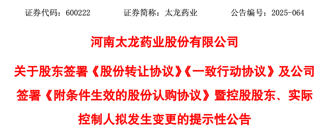 Core Viewpoint - Tailong Pharmaceutical (600222) is set to change ownership to Jiangxi State-owned Assets Supervision and Administration Commission, following a week-long suspension of trading, with significant market reactions observed upon resumption of trading [1] Group 1: Ownership Change - Tailong Pharmaceutical's controlling shareholder, Zhengzhou Tairong Industrial Investment Co., Ltd., has signed a share transfer agreement with Jiang Pharmaceutical Group Jiangxi Medical Holdings Co., Ltd. [1] - The agreement involves the transfer of 50.1 million shares, representing 8.73% of the total share capital, at a price of 11.043 yuan per share, which is nearly a 30% premium compared to the price before the suspension [1] - The total transaction value amounts to 553 million yuan [1] Group 2: Shareholding Structure - After the first delivery of 42.3 million shares, Jiang Pharmaceutical Holdings will directly hold 7.37% of the shares and, through a concerted action arrangement, will control a total of 14.37% of the shares [1] - The controlling shareholder will change from Zhengzhou High-tech Industrial Development Zone Management Committee to Jiangxi Provincial State-owned Assets Supervision and Administration Commission [1] Group 3: Corporate Actions - The company's board has approved a plan for a private placement to Jiang Pharmaceutical Holdings [1]