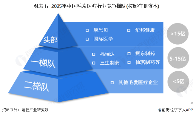 转自:前瞻产业研究院 以下数据及分析来自于前瞻产业研究院毛发医疗行业研究小组发布的《中国美容美发行业市场前瞻与投 资规划分析报告》。 毛发医疗行业主要上市公司:雍禾医疗(02279.HK)、仙琚制药(002332)、*ST 美谷(000615)、益盛药业 (002566)、振东制药(300158)、国际医学(000516)、康惠制药(603139)、康缘药业(600557)、康恩贝 (600572)、福瑞达(600223)等 本文核心数据:中国毛发医疗企业竞争梯队;中国毛发医疗行业市场份额;毛发医疗行业集中度 毛发医疗行业代表性企业主要分布在陕西、浙江、吉林、辽宁、山东、江苏等省份,其中陕西、浙江的 企业数量较多,浙江拥有仙琚制药、康恩贝等生发药品生产企业,陕西拥有康惠制药等生发药品生产企 业、国际医学等拥有植发服务的医疗集团。 1、中国毛发医疗行业竞争梯队 从毛发医疗行业竞争梯队看,注册资本超过15亿元的企业主要有康恩贝、华邦健康、国际医学,处于行 业头部地位;5-15亿注册资本的毛发医疗企业主要有福瑞达、振东制药、三生制药、仙琚制药等,处于 一梯队;其余注册资本小于5亿元的毛发医疗企业处于第二梯队。 2、 ...