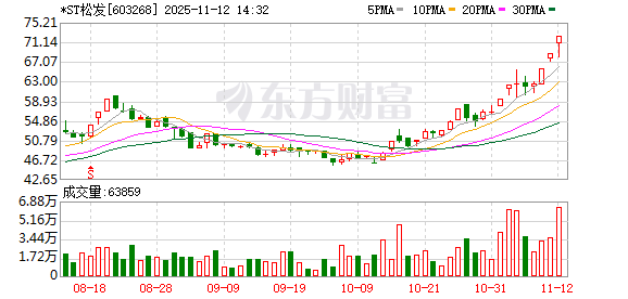 Core Viewpoint - *ST Songfa has experienced a significant stock price increase, achieving three consecutive daily limit-ups, with a total increase of 15.76% during this period [2] Group 1: Stock Performance - As of 14:03, the stock price reached 72.29 yuan, with a turnover rate of 4.58% and a trading volume of 5.681 million shares, amounting to a transaction value of 401 million yuan [2] - The stock's limit-up orders amounted to 1.9591 million yuan, indicating strong buying interest [2] - The total market capitalization of A-shares reached 70.178 billion yuan, with a circulating market capitalization of 8.976 billion yuan [2] Group 2: Financial Performance - In the third quarter, the company reported a total operating revenue of 11.759 billion yuan, representing a year-on-year increase of 237.23% [2] - The net profit for the same period was 1.271 billion yuan, showing a remarkable year-on-year growth of 1614.08% [2] - The basic earnings per share were reported at 2.7400 yuan, with a weighted average return on equity of 30.51% [2] Group 3: Recent Trading Data - The stock has shown notable daily performance, with a daily increase of 5.00% on November 11, 2025, and a net inflow of 19.856 million yuan from main funds [2] - The trading data for the past few days indicates fluctuating performance, with varying turnover rates and net fund inflows [2]