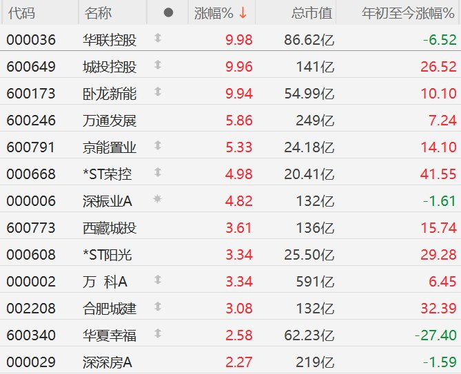 | 代码 | 名称 | | 涨幅% ↓ | 总市值 | 年初至今涨幅%。 | | --- | --- | --- | --- | --- | --- | | 000036 | 华联控股 | 4 | 9.98 | 86.62 乙 | -6.52 | | 600649 | 城投控股 | 1 | 9.96 | 141亿 | 26.52 | | 600173 | 卧龙新能 | 中 | 9.94 | 54.99 Z | 10.10 | | 600246 | 万通发展 | | 5.86 | 249亿 | 7.24 | | 600791 | 京能置业 | 1 | 5.33 | 24.18亿 | 14.10 | | 000668 | *ST荣控 | 1 | 4.98 | 20.41亿 | 41.55 | | 000006 | 深振业A | * | 4.82 | 132亿 | -1.61 | | 600773 | 西藏城投 | | 3.61 | 136亿 | 15.74 | | 000608 | *STMH% | | 3.34 | 25.50亿 | 29.28 | | 000002 | 万 科A | 1 | 3.34 | 59 ...