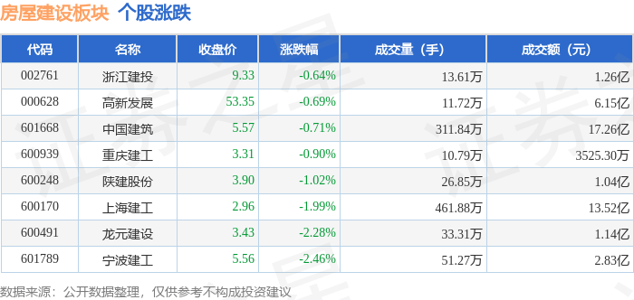 | 代码 | 名称 | 收盘价 | 涨跌幅 | 成交量(手) | 成交额(元) | | --- | --- | --- | --- | --- | --- | | 002761 | 浙江建投 | 9.21 | 1.10% | 13.55万 | 1.24亿 | | 600170 | ┣海建丁 | 66.7 | 1.01% | 652.55万 | 19.50 7 | | 600248 | 陕建股份 | 3.86 | 0.52% | 17.01万 | 6510.41万 | | 601668 | 中国建筑 | 5.44 | 0.18% | 262.09万 | 14.18亿 | | 601789 | 宁波建工 | 5.81 | 0.00% | 74.97万 | 4.36 Z | | 000628 | 高新发展 | 52.41 | -1.11% | 6.35万 | 3.33亿 | | 600491 | 龙元建设 | 3.46 | -1.14% | 21.83万 | 7571.67万 | | 600939 | 重庆建工 | 3.31 | -1.19% | 11.70万 | 3860.37万 | 以上内容为证券之星据公开信息 ...