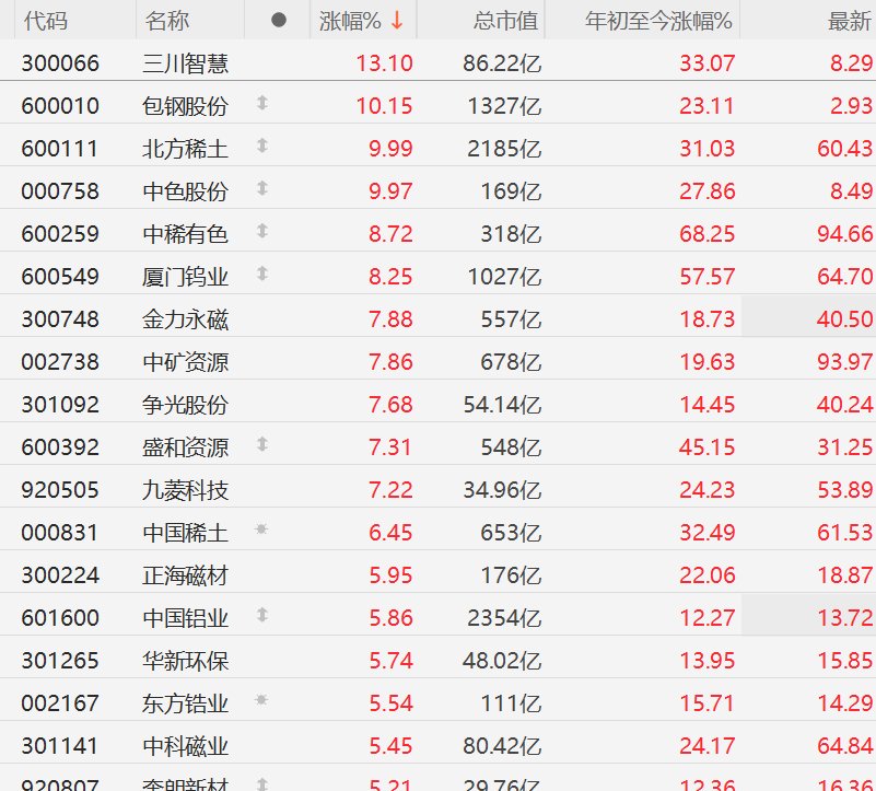 稀土永磁概念股集体走强:包钢股份、北方稀土、中色股份涨停
