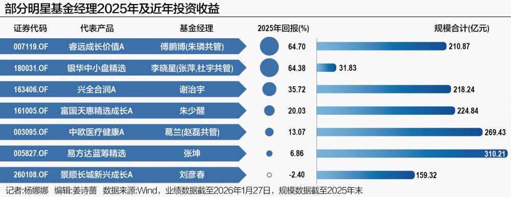 而坚守消费、医药等传统价值板块的基金则普遍承受较大净值压力。2025年四季度,刘彦春的景顺长城新兴成长A亏损5.85%,张坤的易方达蓝筹精选亏损 8.93%,葛兰的中欧医疗健康A更是亏损14.81%。这些基金重仓的消费、医药、港股互联网等板块在去年四季度继续调整。 21世纪经济报道记者 杨娜娜 2025年四季度,市场波动有所加大,A股和港股在震荡中收官,结构性行情演绎至极致。Wind数据显示,去年四季度上证指数上涨2.22%,沪深300指数下跌 0.23%,创业板指下跌1.08%。此外,恒生指数下跌4.56%,恒生中国企业指数下跌6.72%。 主要指数表现平淡,但内部行业却冰火两重天。以AI算力、半导体为代表的科技成长板块高歌猛进,石油石化、国防军工、有色金属等行业表现较好,而 房地产、医药、计算机等行业表现相对承压。 随着公募基金2025年四季报披露完毕,傅鹏博、朱少醒、张坤、葛兰、谢治宇、李晓星、刘彦春等明星基金经理的持仓动向与后市展望浮出水面。这种极致 的市场风格,也映射出这些公募明星基金经理们截然不同的投资路径,这些分化直接体现在他们的净值曲线上。 | | | | | | 部分明星基金经理2025年及 ...