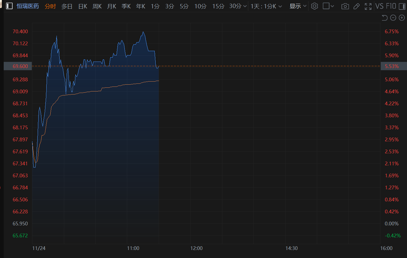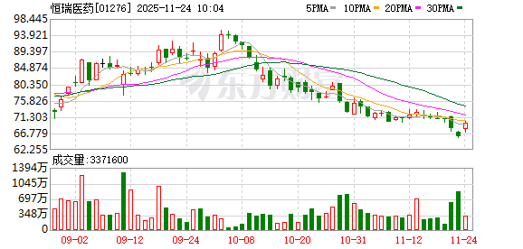 港股频道更多独家策划、专家专栏,免费查阅>>责任编辑:栎树 11月24日,恒瑞医药(1276.HK)今日高开高走,盘中一度涨约7%,现报69.6港元,总市值4619亿港元。消息上,恒瑞医药日 前公告称,公司及子公司近期收到国家药监局核准签发关于注射用SHR-9839(sc)、注射用SHR-A2009等多款药物的《药物临 床试验批准通知书》,将于近期开展临床试验。这些药物包括SHR-9839、SHR-A2009、SHR-1826、HRS-4642注射液、阿得 贝利单抗注射液、瑞康曲妥珠单抗、SHR-A2102、HRS-7058胶囊和片剂。 根据相关法律法规要求,这些药物在获得临床试验批准通知书后,尚需开展临床试验并经国家药监局审评、审批通过后方 可生产上市。有分析指出,一次公告9款药物(不包括SHR-1139)获批临床,充分证明了恒瑞医药强大的研发效率和丰富的 产品管线储备,这是其长期竞争力的核心。 ...