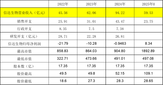| | 2022年 | 2023年 | 2024年 | 2025年H | | --- | --- | --- | --- | --- | | 信达生物营业收入(亿元) | 45. 56 | 62.06 | 94. 22 | 59. 53 | | 销售开支 | 25.91 | 31.01 | 43. 47 | 23.75 | | 行政开支 | 8.35 | 7.5 | 7.38 | | | 研发开支(亿元) | 28. 71 | 22.28 | 26.81 | | | 信达生物归母净利润 | -21.79 | -10.28 | -0.9463 | 8.34 | | 最高市值 | 858.83 | 864.03 | 904.80 | 1892.89 | | 最低市值 | 322.71 | 473.66 | 491.01 | 497.08 | | 股本数(亿) | 17.35 | 17.35 | 17.35 | 17.35 | | 股价最高 | 49.5 | 49.8 | 52.15 | 109.1 | | 股价最低 | 18.6 | 27.3 | 28.3 | 28.65 | 来源:理忱视野 在《从Biotech ...
