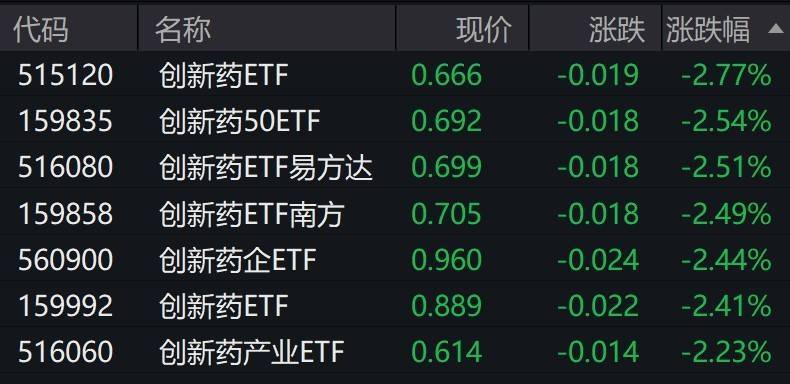 创新药概念股走弱,康龙化成跌超5%,科伦药业、信立泰跌超3%,恒瑞医药、长春高新、复星医药、华东医 药、百济神州-U跌超2%。 受盘面影响,创新药相关ETF跌超2%。 | 代码 | 名称 | 现价 | 涨跌 | 涨跌幅 ▲ | | --- | --- | --- | --- | --- | | 515120 | 创新药ETF | 0.666 | -0.019 | -2.77% | | 159835 | 创新药50ETF | 0.692 | -0.018 | -2.54% | | 516080 | 创新药ETF易方达 | 0.699 | -0.018 | -2.51% | | 159858 | 创新药ETF南方 | 0.705 | -0.018 | -2.49% | | 560900 | 创新药企ETF | 0.960 | -0.024 | -2.44% | | 159992 | 创新药ETF | 0.889 | -0.022 | -2.41% | | 516060 | 创新药产业ETF | 0.614 | -0.014 | -2.23% | 有机构表示,近期我国生物科技领域利好频传,产业层面,多家创新药企在E ...