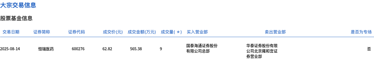 | 2025-08-14 | 恒瑞医药 | 600276 | 62.82 | 565.38 | 国泰海通证券股份 有限公司总部 | 华泰证券股份有限 公司北京雍和宫证 | | --- | --- | --- | --- | --- | --- | --- | | 交易日期 | 证券简称 | 证券代码 | 成交价(元) 成交金额(万元) 成交量( * ) 买入营业部 | | | 卖出营业部 | 8月14日,恒瑞医药大宗交易成交9万股,成交额565.38万元,占当日总成交额的0.16%,成交价62.82元,较市场收盘价62.82元持平。 ...