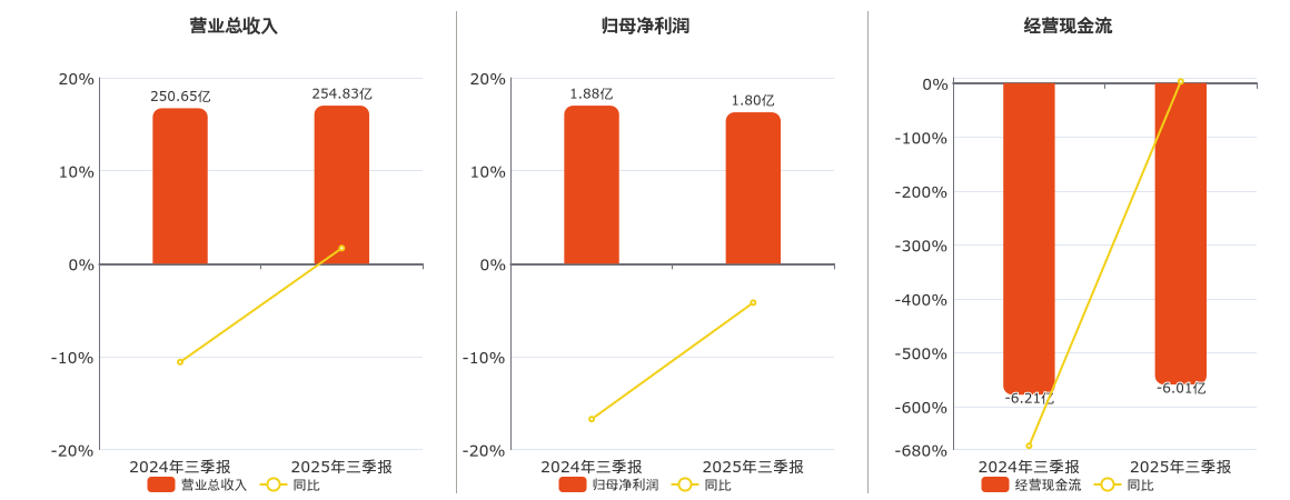 Core Insights - The company reported a total revenue of 25.483 billion yuan for Q3 2025, ranking 7th among disclosed peers, with a year-on-year increase of 418 million yuan, representing a growth of 1.67% [1] - The net profit attributable to shareholders was 180 million yuan, ranking 4th among peers, showing a decrease of 7.8717 million yuan compared to the same period last year, which is a decline of 4.19% [1] - The net cash inflow from operating activities was -600 million yuan, ranking 11th among peers, with an increase of 20.162 million yuan compared to the same period last year [1] Financial Ratios - The latest debt-to-asset ratio is 52.80%, ranking 3rd among peers, with a decrease of 2.43 percentage points from the previous quarter and a decrease of 2.62 percentage points from the same period last year [3] - The latest gross profit margin is 4.70%, ranking 7th among peers, with a decrease of 0.47 percentage points from the previous quarter and a decrease of 0.20 percentage points from the same period last year [3] - The latest return on equity (ROE) is 2.33%, ranking 6th among peers, with a decrease of 0.14 percentage points from the same period last year [3] Earnings Per Share and Turnover Ratios - The diluted earnings per share is 0.21 yuan, ranking 4th among peers, remaining stable compared to the same period last year [3] - The latest total asset turnover ratio is 1.42 times, ranking 6th among peers, with a decrease of 0.01 times from the same period last year [3] - The latest inventory turnover ratio is 11.07 times, ranking 4th among peers, with a decrease of 1.10 times compared to the same period last year, representing a decline of 9.03% [3] Shareholder Information - The number of shareholders is 26,300, with the top ten shareholders holding 607 million shares, accounting for 69.19% of the total share capital [3]