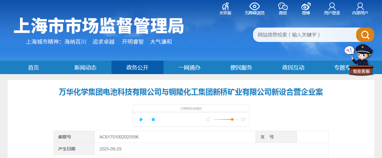 万华化学集团电池科技有限公司与铜陵化工集团新桥矿业有限公司新设合营企业案